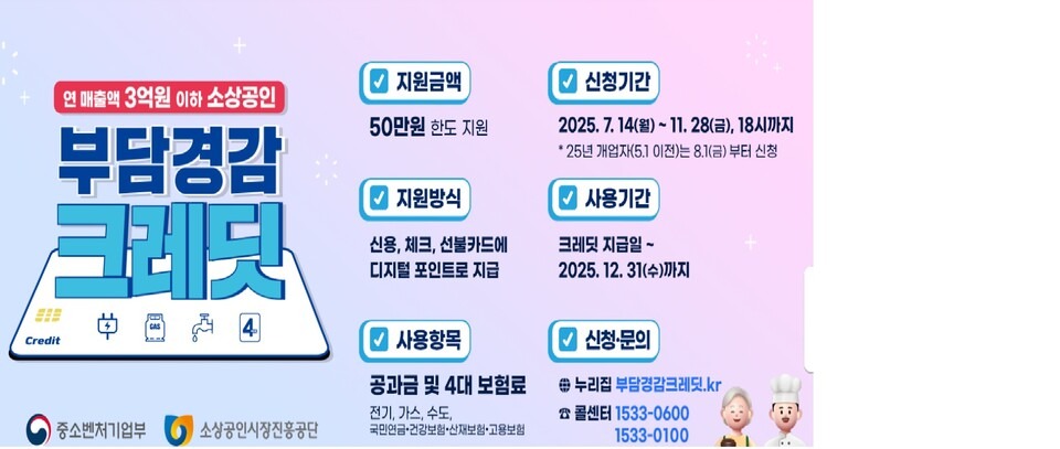 고물가와 고금리로 어려움을 겪는 영세 소상공인을 위해 정부가 고정비 일부를 직접 지원하는 부담경감크레딧은 사업장 운영의 경제적 부담을 덜어주는 가장 명확한 디지털 민생 지원 통로입니다.