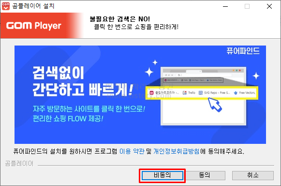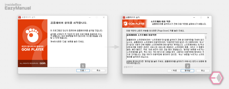 - 약관 동의 : 설치 과정에서 약관에 동의해야 합니다. '동의' 버튼을 클릭합니다.