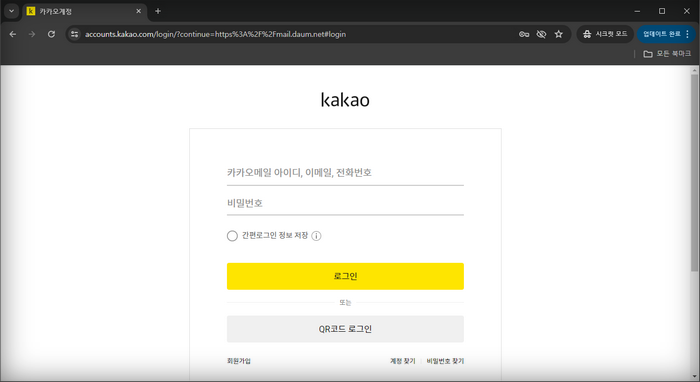 - 로그인 화면이 나타나면, 카카오 계정으로 로그인하거나 기존의 다음 아이디로 로그인할 수 있습니다.
