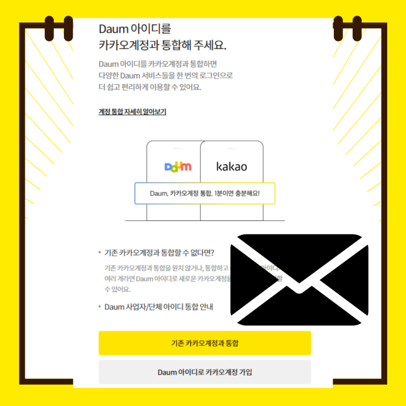 다음 메일과 카카오 계정을 연동하면, 두 계정을 통합하여 사용할 수 있습니다. 연동 방법은 다음과 같습니다.