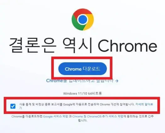 - 다운로드 버튼 클릭하기 : 페이지에 들어가면 "Chrome 다운로드" 버튼이 보입니다. 이 버튼을 클릭하여 다운로드를 시작합니다.